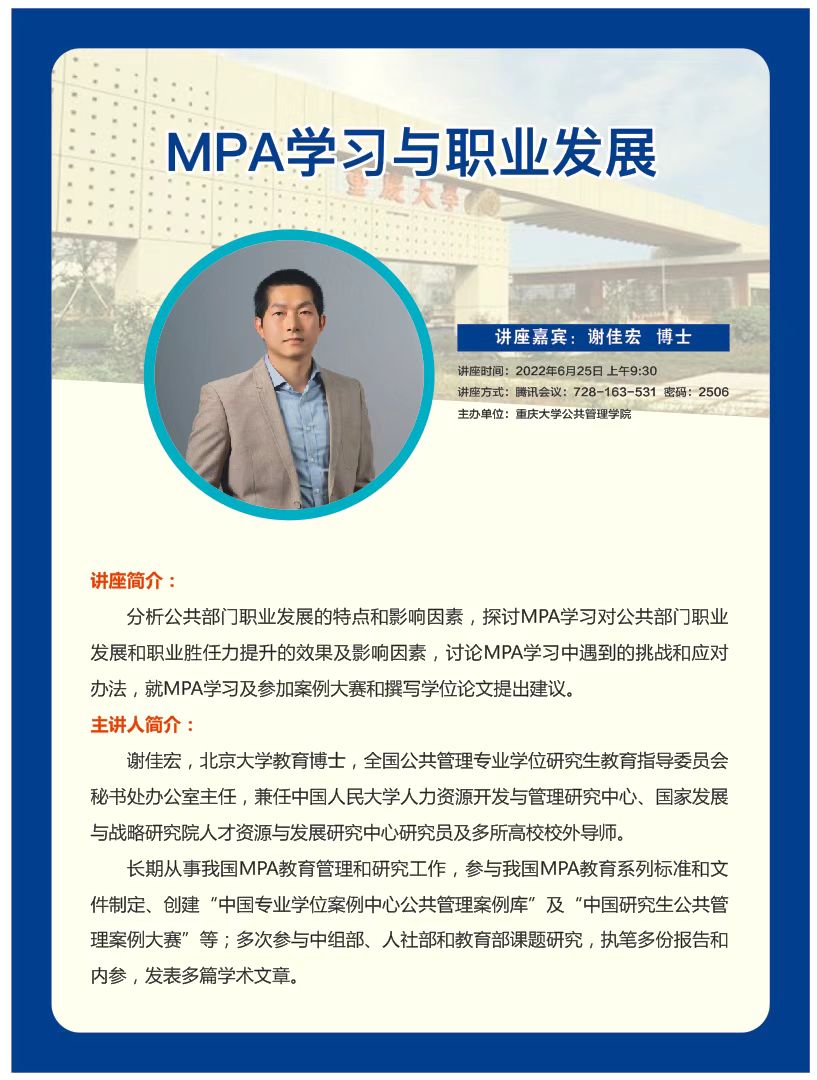 6月25日上午,全国公共管理专业学位研究生教育指导委员会秘书处办公室主任谢佳宏博士,应邀在线为我院师生作题为《MPA学习与职业发展》讲座。我院MPA导师和学生300余人参与本次讲座,MPA中心主任冉戎教授主持报告会。谢主任从MPA学生职业发展规划、MPA学生学习能力塑造、我国MPA教育发展概况、MPA培养规模、案例大赛,论文规划等多个方面进行了介绍,为同学们传道解惑。讲座中谢主任还与师生进行互动,回答了就读期间的职...