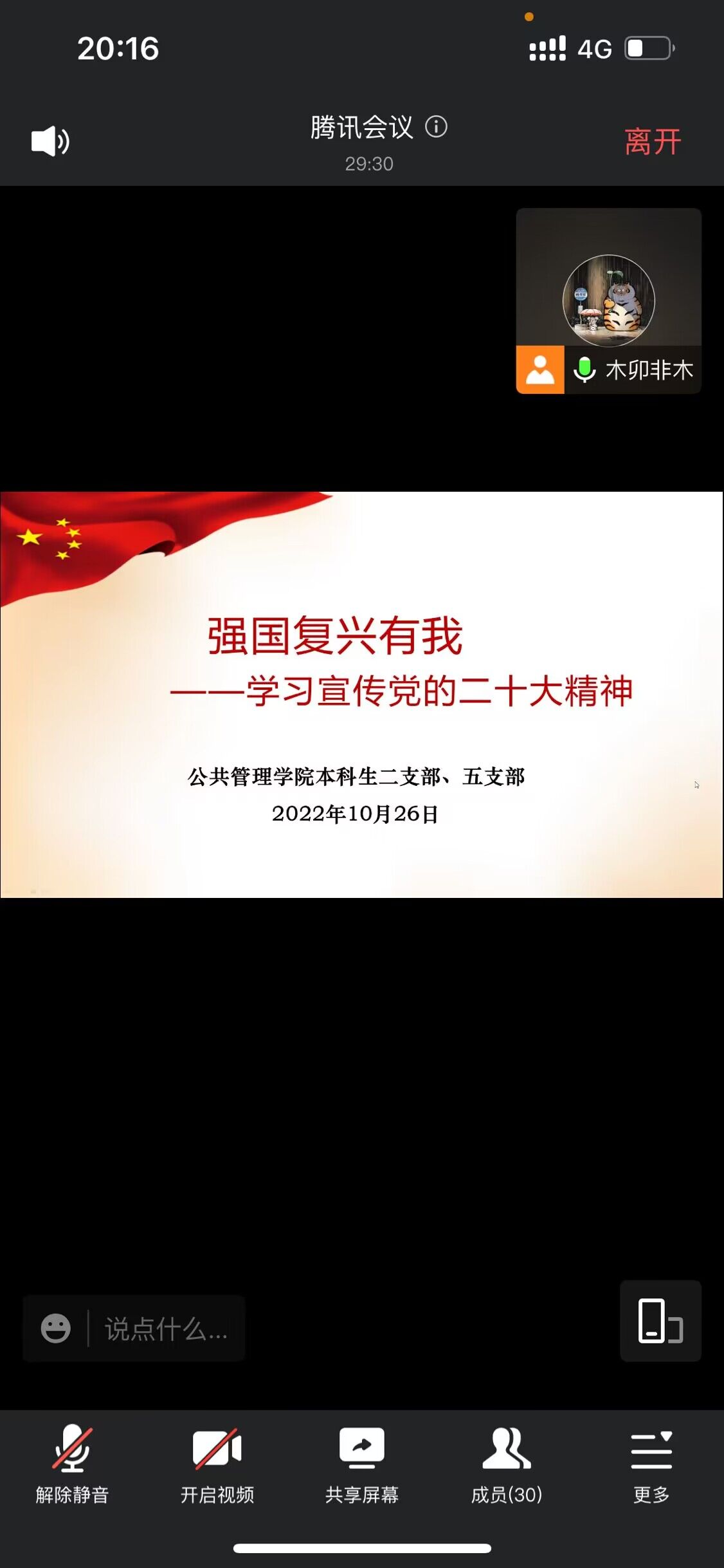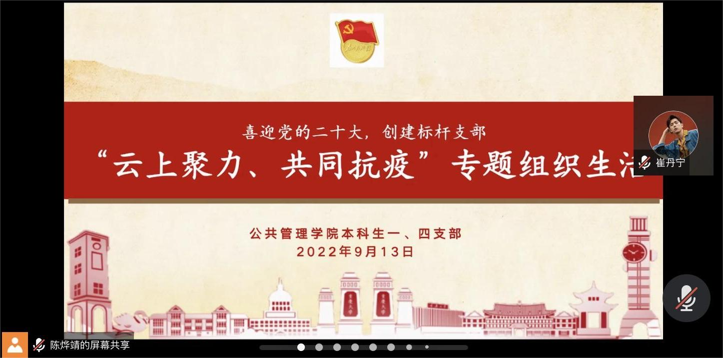 2022-09-28新学期伊始,疫情阻挡了大家返校的步伐,但无数逆行者冲锋在前,为早日返校、战胜疫情默默奉献。在返校之际,69书吧 本科生一、四支部于2022年9月13日下午3时在线上开展了“喜迎党的二十大,创建标杆支部”主题教育系列活动之“云上聚力,共同抗疫”专题活动。69书吧 本科生一、四支部全体党员参会。此次活动分为视频学习、抗疫精神、手写祝福、交流分享四个部分。首先,在视频学习部分,由主持人陈烨靖同志带领大家...