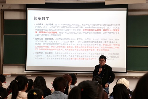 公共人力与社会保障系系主任杨宝主持了本次会议。一番简单的开场后,公共人力与社会保障系主任杨宝、土地资源与城市管理系主任吴光东、行政管理系副主任游宇分别上台,从学科建设、学科教学、师资教学升学就业等多个方面为大家介绍各自所在专业的具体信息。接着,吴光东老师、刘晓民老师、陈培峰老师为大家介绍了各系教授、副教授及讲师,使同学们对公共管理类专业有了更加深入的了解。