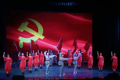 学院本次的参赛曲目为《党旗飘飘》。借助歌曲所反映我们党的发展历程,结合公管学子的全新演绎,我们传达了心中对党的感激,表现了当代大学生勇担民族复兴大任不畏艰难,积极向上的精神风貌。悠扬的音乐奏响,舞台上的灯光随之缓缓点亮。公管健儿们身着军服,挥舞着鲜艳的旗帜闪亮登场。“春风吹开花季的笑容,你用慷慨播种大地葱笼……”歌声响起,身着红色连衣裙的公管姑娘们面带微笑,纤细灵动的手指伴随着音乐翩翩起舞。经过将近一个月的反复练习、改进,融合了舞蹈、舞旗、短剧、朗诵,学院带来的这首《党旗飘飘》整齐流畅、巧思精构,令广大师生耳目一新,无疑是一场有剧情、有温度、更有深度的视听盛宴,赢得了台下观众的阵阵掌声。