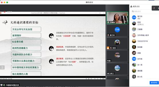 为认真学习贯彻习近平总书记关于教育的重要论述和全国教育大会精神,聚焦立德树人根本任务,把思想政治教育贯穿人才培养体系,全面推进我院课程思政建设,提高教师育人的思想自觉和综合能力,学院2022年4月22日 上午10点邀请了重庆市课程思政教学名师万曼璐老师为全院教职工开展了线上课程思政培训专题讲座——“文明传承,你我之责——课程思政在文科课程的有机融入”。学院全体教师通过线上腾讯会议的方式参与了讲座学习。