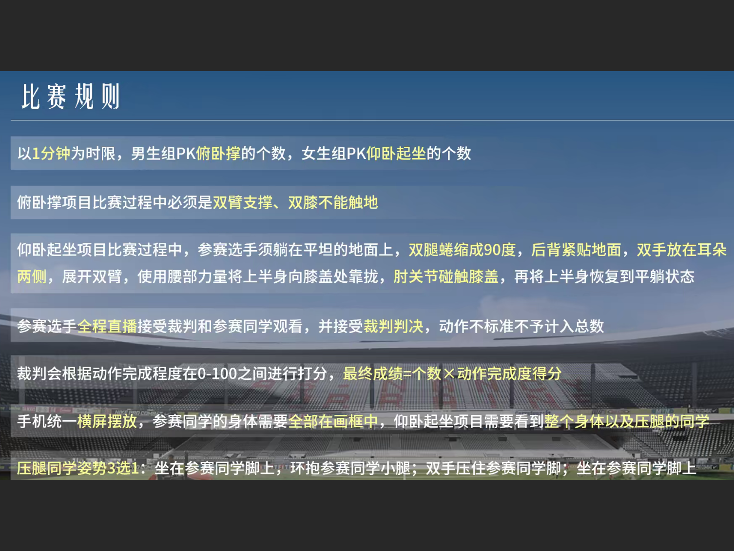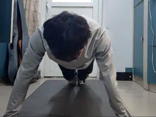 按照事先分组,同学们依次打开摄像头参加比赛。首先是男生们的俯卧撑比赛,每一个参赛选手都在规定时间内完成了比赛,表现出对运动的热情。