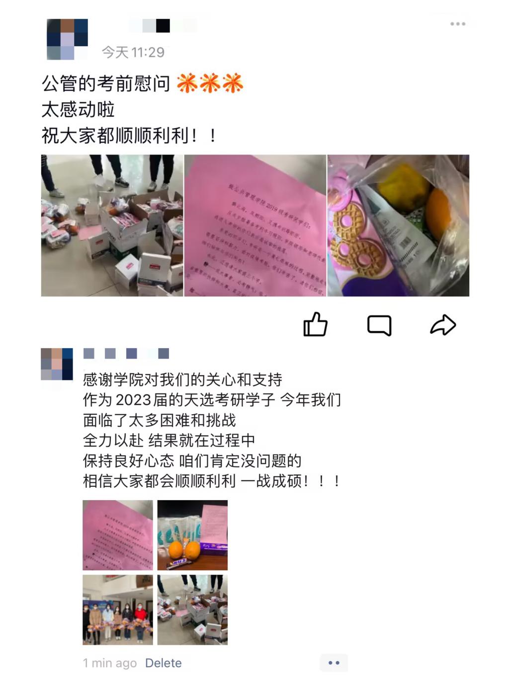 鹏北海,凤朝阳,又携书剑路茫茫。从炎炎酷暑到冬日暖阳,公管的考研学子们孜孜不倦地备考学习。通过此次考研学生慰问活动,很好地帮助了考研学子缓解备考压力,鼓舞了考研士气,进一步坚定了考研信心。相信在学院的关怀和帮助下,同学们将带着学院和老师们的关怀,脚踏实地,奋勇向上,争取佳绩,收获自己满意的成绩!公管学子们,考研加油,你们就是最棒的!