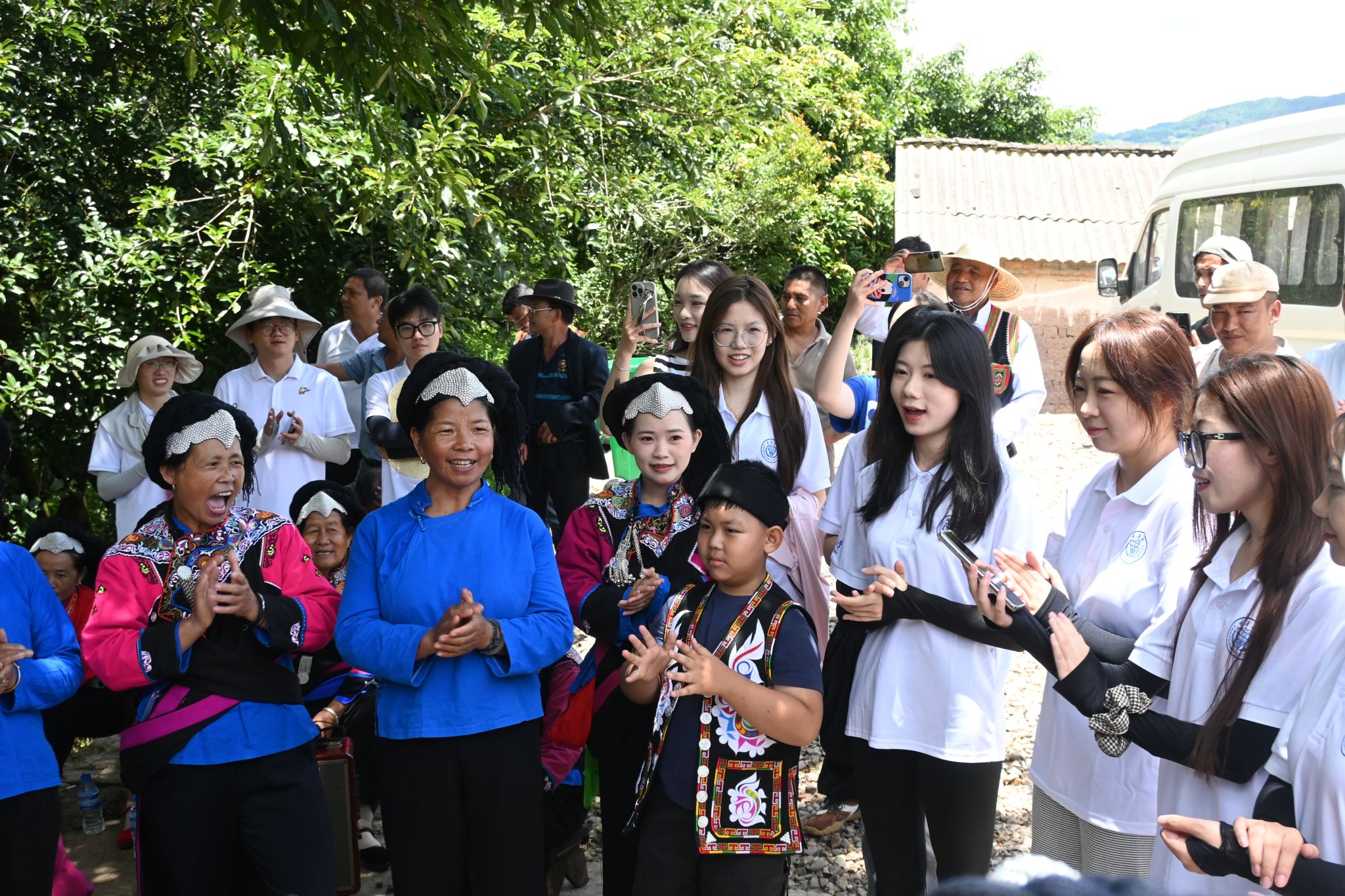 图为服务团成员和彝族村民合唱《我和我的祖国》