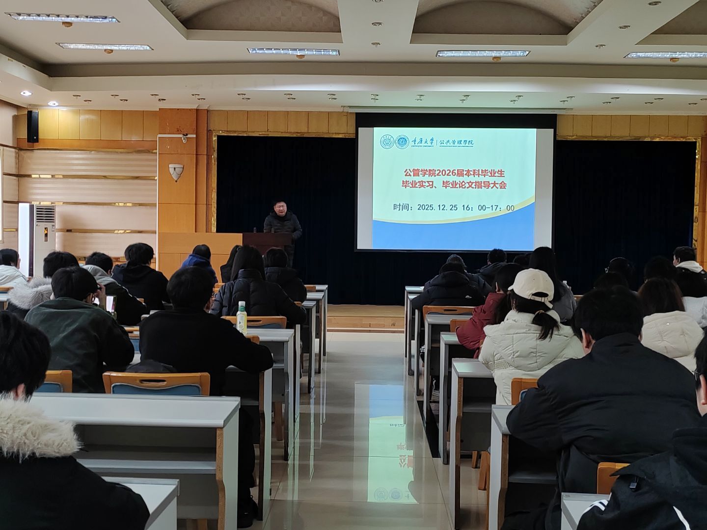 为精准赋能2026届本科毕业生稳步推进毕业论文撰写、圆满完成毕业实习任务,2025年12月25日下午16:00,学院在102报告厅隆重召开专题指导大会。学院党委副书记、纪委书记周余斌,副院长丁从明莅临会议指导,会议由2026届本科毕业生辅导员王丽娟主持,全体毕业生齐聚现场参会。