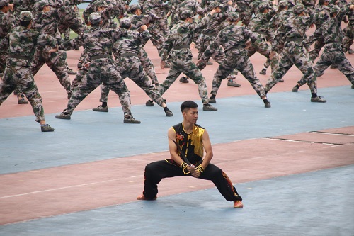 分列式表演完毕,伴着“研究学术,造就人才,佑启乡邦,振导社会”的嘹亮口号,擒敌拳方阵按照队形依次散布开来。在教官的指示下,擒敌拳方阵一令一动,首先进行了16个招式分解动作的表演;紧接着,随着教官一声令下,擒敌拳方阵开始连贯16招的表演。整个方阵步伐沉稳,出拳一致,“下蹲侧踹”“顺手牵羊”“上步抱膝”等招式强劲有力,虎虎生威。表演结束,擒敌拳方阵迅速恢复原始队形,绕向后方列队,整个过程干脆利落,迅速整齐,彰显了学院男生在军训过程中受到的良好训练。看台上的袁书记和王老师连连点头,欣慰地感慨道,希望同学们能将这身正气,这股精神,这份纪律一直延续下去,让此次军训的成果添益同学们的整个大学生活。