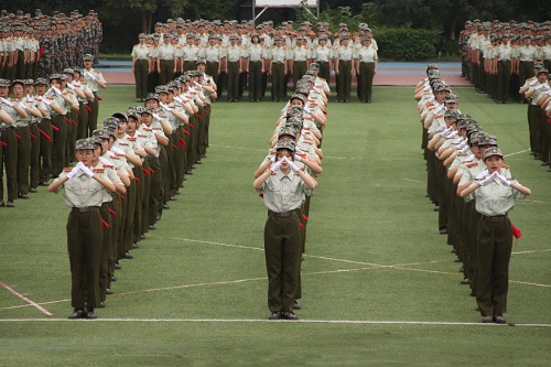 大会的第一项议程是升国旗。在军训师参谋长的指挥下,在场的全体人员起立面向国旗,行注目礼。金秋九月,丹桂飘香,随着庄严的国歌奏响,鲜艳的五星红旗在微风中舒展开来,在全校师生、教官的注视下缓缓升起。随着最后一个音符的敲响,升旗仪式结束。紧接着进行的是分列式表演,中国人民解放军进行曲在空旷的操场上方响起,各方阵迈着整齐的步伐,精神抖擞,斗志昂扬地依次列队自主席台前走过,接受领导老师们的检阅。