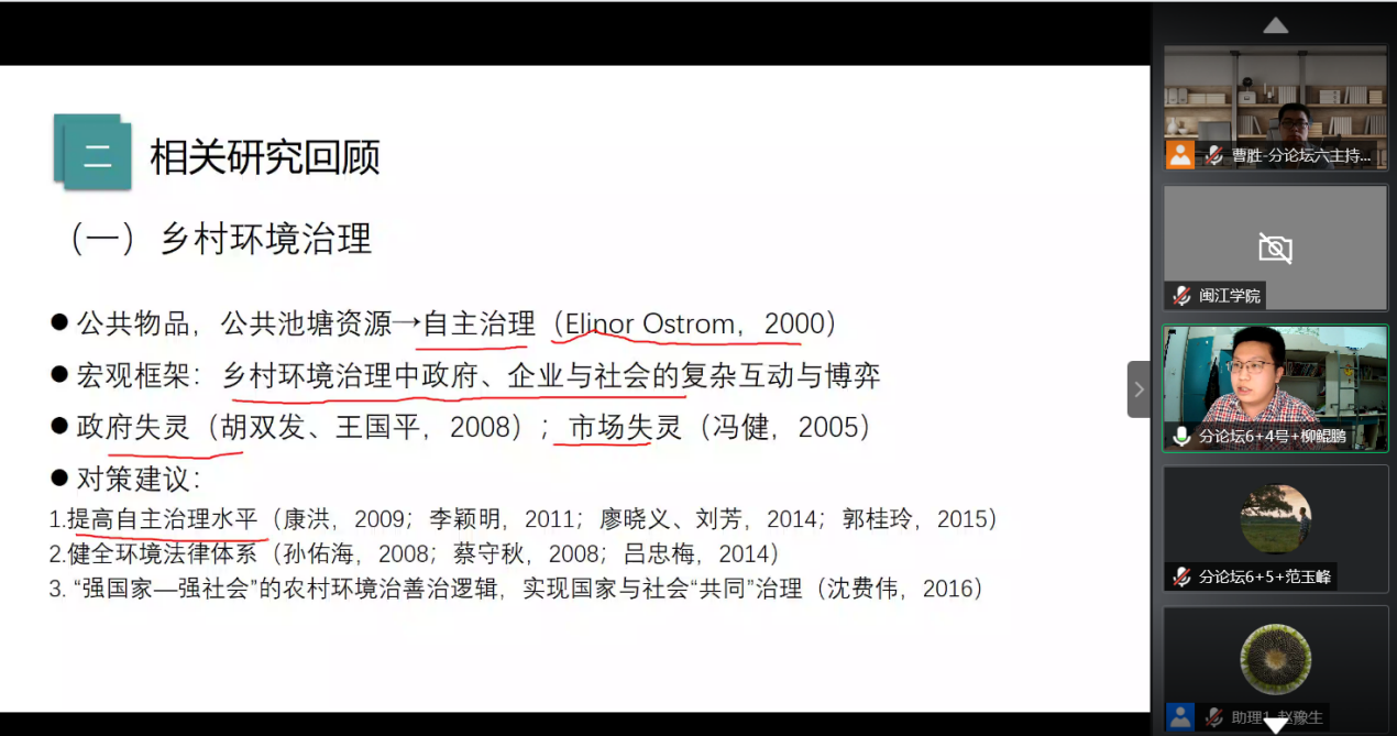 柳鲲鹏同学汇报的论文是在我院彭小兵教授指导下完成的《协同性治理:一种乡村环境治理模式及其内在机制》,柳鲲鹏同学分别从问题的提出、相关文献回顾、进入个案、理论建构、总结与讨论五个方面进行了报告。基于乡村振兴的战略背景,柳鲲鹏同学化用Ansell和Gash的协同治理分析框架,对重庆市Q镇B村的环境治理实践进行理论演绎,构建出以院坝会为议事机构(公共论坛),以村规民约为行事规范,以“组织动员机制”“利益协调机制”和“政府监督机制”为治理系统,政府、企业、村委会、村民等多主体角色明确、互动参与的合作架构。