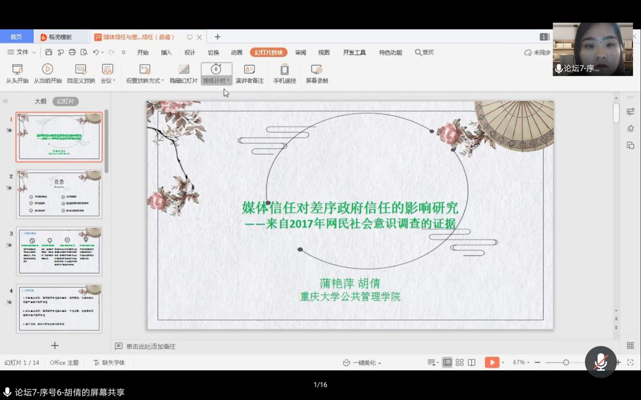 下午15时许,胡倩同学在平行分论坛七:社会治理与民生保障分论坛分享了自己的学术论文,胡倩同学汇报的论文是在我院蒲艳萍教授指导下完成的《媒体信任对差序政府信任的影响研究——来自2017年网民社会意识调查的证据》,胡倩同学主要从媒介视角切入,借助2017年网民社会意识调查数据,实证探究官方媒体信任和非官方媒体信任对差序政府信任的影响。认为提升基层政府信任和实现政府信任层级均衡化应从高层政府、基层政府和网民三个主体出发。深圳大学城市治理研究院副院长、副教授谷志军老师,就胡倩的汇报从理论、方法、变量等方面提出了相关的建议。胡倩同学也表示,谷老师的点评很到位,对自己的论文修改有很大的帮助,参加此次会议自己也是收获颇多。