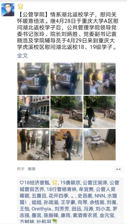 领导老师高度重视,坚决做到打通学院疫情防控的“最后一公里”。4月29日上午11点,学院党委书记张玲、党委副书记袁晓浩及学院辅导员走访虎溪校区,看望慰问16名18、19级本科生和19级研究生的湖北返校学子。