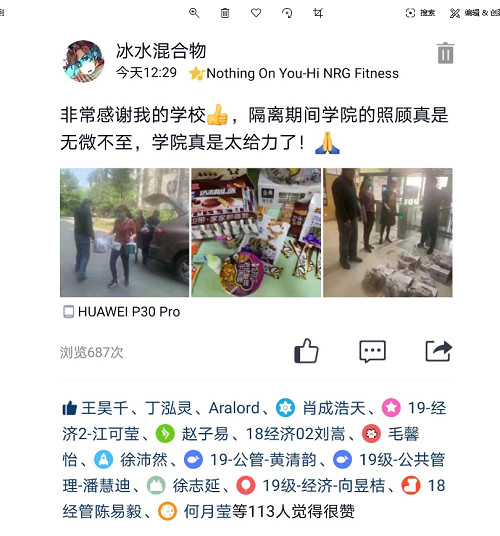 湖北返校学子们对学院的这种“家人式”的关爱表示感谢,有同学通过发朋友圈的方式感慨道:“返校过后,学院的一切安排都很周到。学院领导老师们很体贴、很温暖,疫情期间,仍然带着丰厚的礼品前来慰问。时刻牵挂着我们,关心着我们,真的非常感谢69书吧