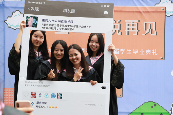 典礼开始前,全体毕业生、教师代表和部分家长走过毕业照片墙,一张张照片记录着毕业生们大学期间青春洋溢、精彩纷呈的生活与风采,毕业生和家长、老师们在照片墙前合影留念。师生共同回忆在校学习生活的美好场景,仿佛一切就在昨天,老师们的诲人不倦和殷切期望一直萦绕耳畔。