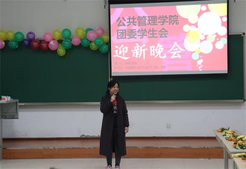 七时整,晚会准时开始。在主持人介绍对到场的嘉宾做过介绍之后,刘淳副书记首先发表了讲话。她说:“学期即将结束,新的一年即将到来,同学们做的每件事,老师们都看在眼里,非常感谢团委学生会的每一位同学这个学期的默默贡献,为我们学院的添砖加瓦。” 刘书记还引用了古代圣贤对“士”的理解,对团委学生会的同学们进行了勉励,并对新年有了新的期许。