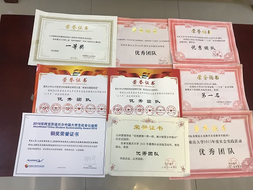 不仅如此,让老师们更加欣慰的是,同学们还会利用暑期实践的机遇,联系自身专业所学,将知识与实际生活相结合。2011年,实践团在贵州西江苗寨进行支教调研的同时,还立项参加“挑战杯”全国大学生课外学术科技作品竞赛,该团队的《旅游业发展背景下民族社区环境保护的组织机制创新》一文在作为团队指导老师的罗章教授指导下,获得了第十二届“挑战杯”西安世园会专项赛全国特等奖;2015年暑期团中央赴陕西大荔教育关爱服务团在2016“阿克苏诺贝尔中国大学生社会公益奖”获铜奖;2017年赴“安徽歙县教育关爱服务团”由马铭阳、张金梦、寇桂涛撰写《党员有党性,千亩种荒山》成功收录到《“千校千项”》,2018暑期“实地聚焦一带一路,献计献策乡村振兴”为主题的实践活动,入围团中央“丝路新世界·青春中国梦”全国专项以及重庆市暑期“三下乡”重点项目、69书吧