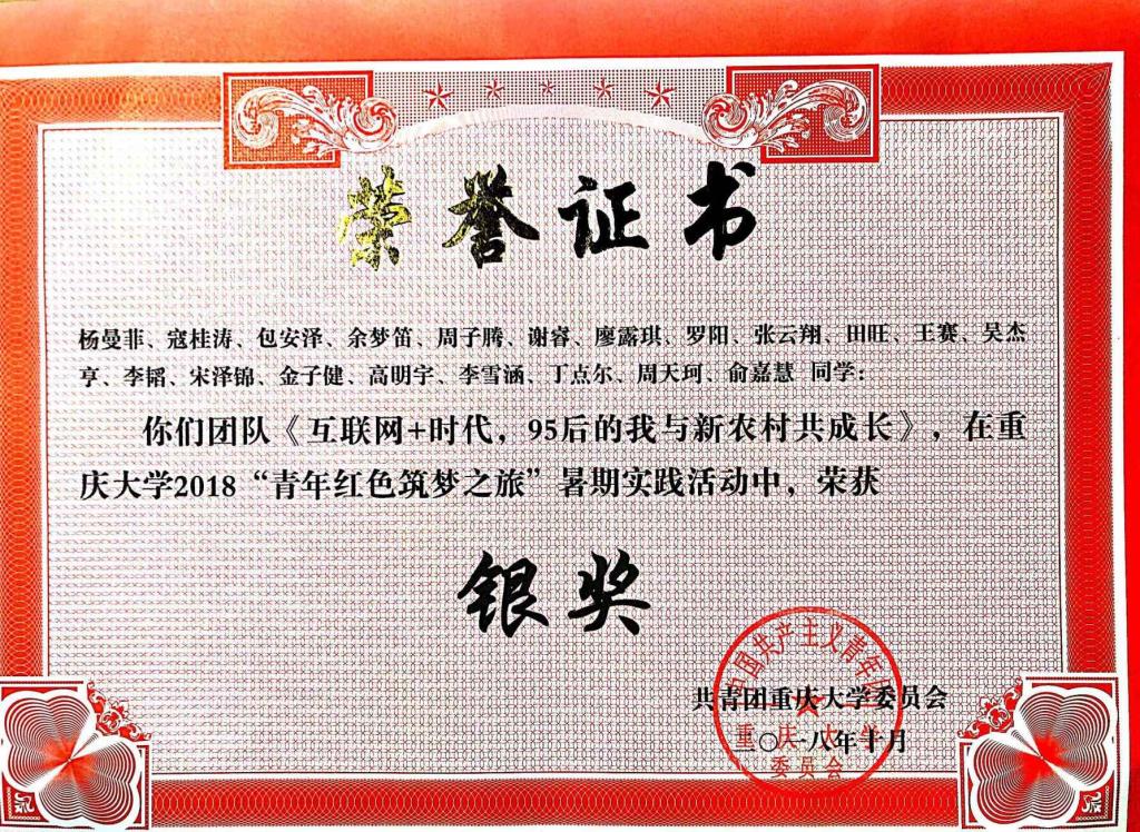 大中专学生志愿者暑期“三下乡”社会实践活动“优秀团队”荣誉称号。