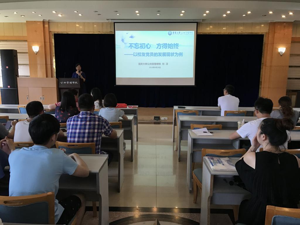 然后,刘淳为全体同志上了毕业前最后一堂党课,题目为“不忘初心、方得始终——以校友党员的发展现状为例”。她借走访慰问校友的契机,梳理了部分校友党员的学习经历和工作情况,并深情回忆了他们在校读书期间的点点滴滴,和大家分享了他们的成长故事与心得。她介绍到,我院毕业生很多都走上了公务员、选调生、银行和地产等行业的工作岗位,其中的党员同学都有不错的发展,希望大家能以他们为榜样,提高觉悟、以身作则,努力学习、艰苦奋斗,为自己、为学院、为社会做出一名共产党员应有的贡献。她祝愿大家都能前程似锦、一切顺利。
