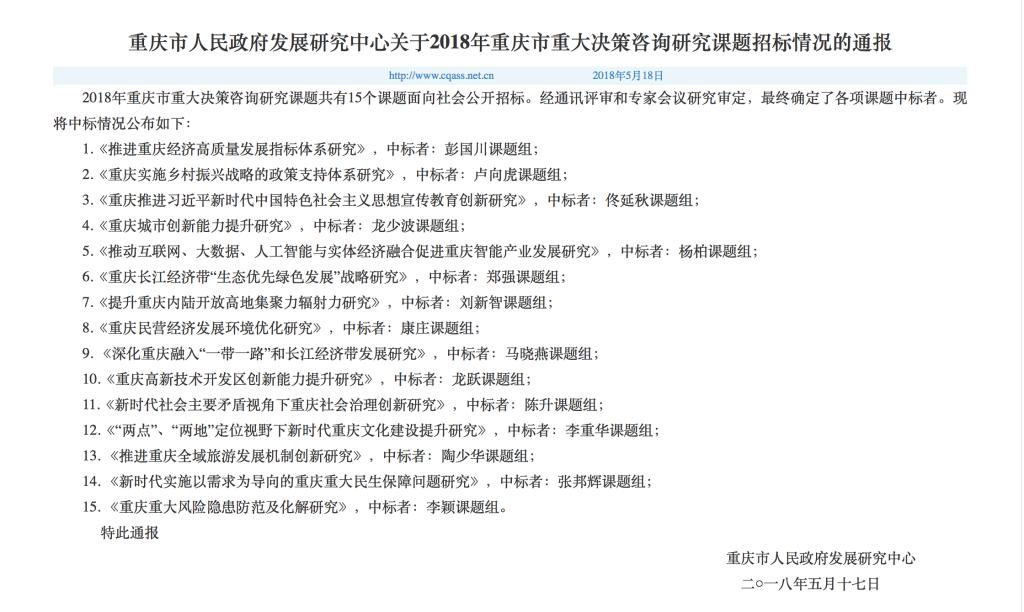 2018年5月17日,重庆市人民政府发展研究中心在其官网主页
