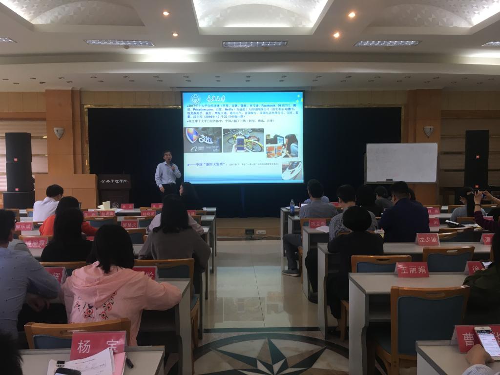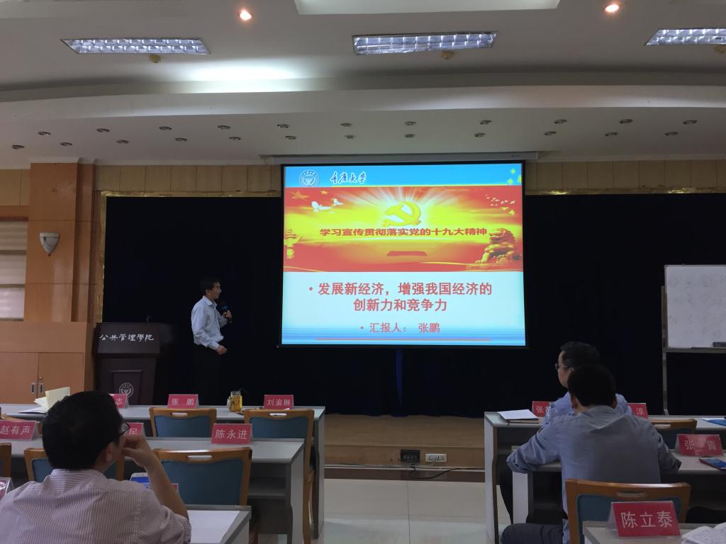 党委在学院多功能厅组织全体教职员工开展政治学习。学院党委委员、副院长张鹏教授以“发展新经济,增强我国经济的创新力和竞争力”为主题讲授党课,主要讲述十九大报告中经济发展相关话题。学院党委书记兼常务副院长张邦辉教授主持学习。