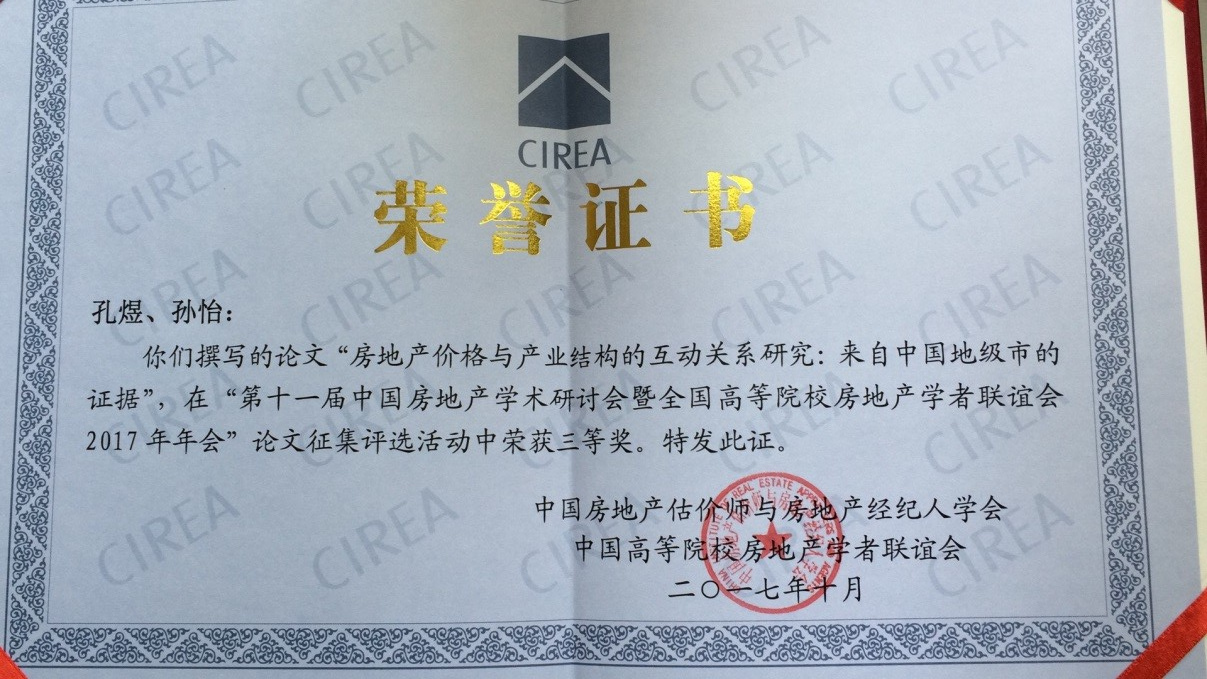 此次会议各论坛总共接收174篇论文,168篇参加优秀论文的评审,评出了优秀论文35篇,其中一等奖5篇,二等奖10篇,三等奖20篇,孔煜教授和指导的研究生孙怡共同撰写的论文《房地产价格与产业结构的互动关系研究:来自中国地级市的证据》获得三等奖。