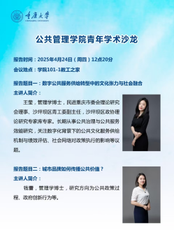 4月24日中午,我院行政管理系的钱蕾副教授和王莹博士分别做了题为《城市品牌如何传播公共价值?》《数字公共服务供给转型中的文化张力与社会融合》的报告,深度分享和交流了各自的研究兴趣和学术前沿方向。钱蕾分享了近期研究选择中国文明城市作为公共品牌的代理变量,企业社会责任作为价值共创行为的代理变量,研究发现,文明城市品牌显著提升了企业的社会责任。王莹聚焦数字公共服务供给中的文化张力与社会融合,探讨了技术转型背后的文化适配机制与制度整合路径,涵盖公共养老、文化等多个服务场域的实证研究与理论探索。