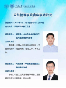 6月12日中午,我院公共人力与社会保障系的蔡康鑫博士和李毅博士分别做了题为《抓考勤:企业危机中的秩序产生与规范博弈再平衡》《与国咸休:中国差序慈善信任的结构与生成》的报告。蔡康鑫的研究从“利益-规范”双重博弈的视角分析了企业在考勤管理上的决策行为,解释了时间作为社会规范如何在制度变迁中被重塑。李毅汇报的《与国咸休:中国差序慈善信任的结构与生成》,尝试将慈善信任放置在中国独特的国家-社会关系框架下,从“政府信任”及“信任迁移机制”入手,解释中国慈善信任的生成逻辑。