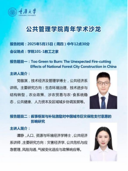 5月15日中午,我院公共经济系的党敬淇博士和谭静博士分别做了题为《Too Green to Burn: The Unexpected Fire-cutting Effects of National Forest City Construction in China》《叙事框架与补贴激励对中国城市巨灾保险支付意愿的影响研究》的报告。党敬淇的研究利用交叠倍差法揭示了中国国家森林城市建设通过完善火灾预防和响应机制削减火灾频率与强度的政策边际因果效应,刻画了综合性生态环境政策产生的预期外防灾减灾收益。谭静的研究基于行为经济学理论框架,采用多阶段分层随机抽样方法,在成都和重庆选取1000户城市家庭开展实验研究。通过2×3因子设计(叙事类型×补贴方式),运用混合研究方法系统考察了不同干预策略对巨灾保险支付意愿的影响机制。研究发现,情感叙事框架通过风险感知和情感唤起双重路径显著提升投保意愿,且与定向补贴政策存在显著协同效应。研究结果为优化巨灾保险政策设计和风险沟通策略提供了重要参考。