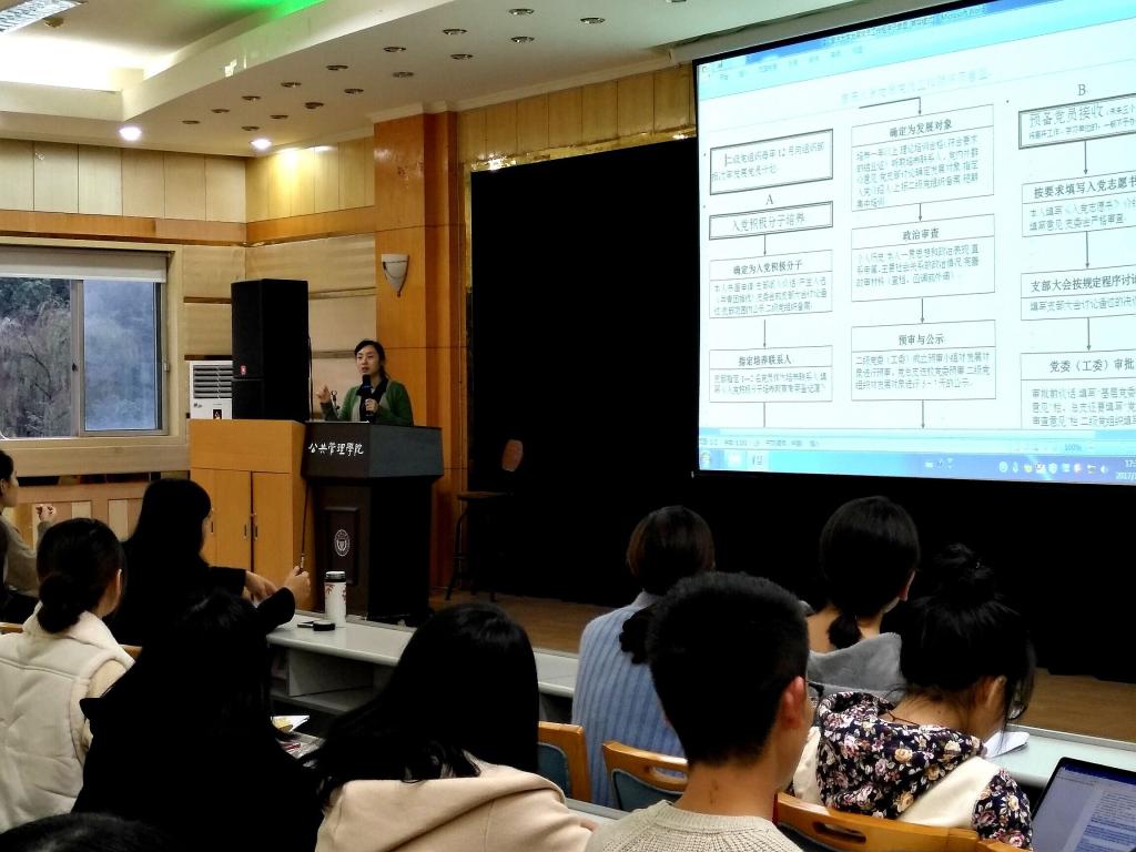 何薇首先介绍了学院党委发展党员的选拔要求和原则,希望这次发展的党员珍惜机会,切实以实际行动入党。接着,何薇向大家介绍了发展党员工作的流程、要求及所需要提交的材料。然后,对入党志愿书、政审、函调等每一种材料的填写要求都进行了详细的说明。特别是对一些容易出错的地方再三进行了强调。接下来对党员材料摆放顺序等相关注意事项向与会同学进行了说明。