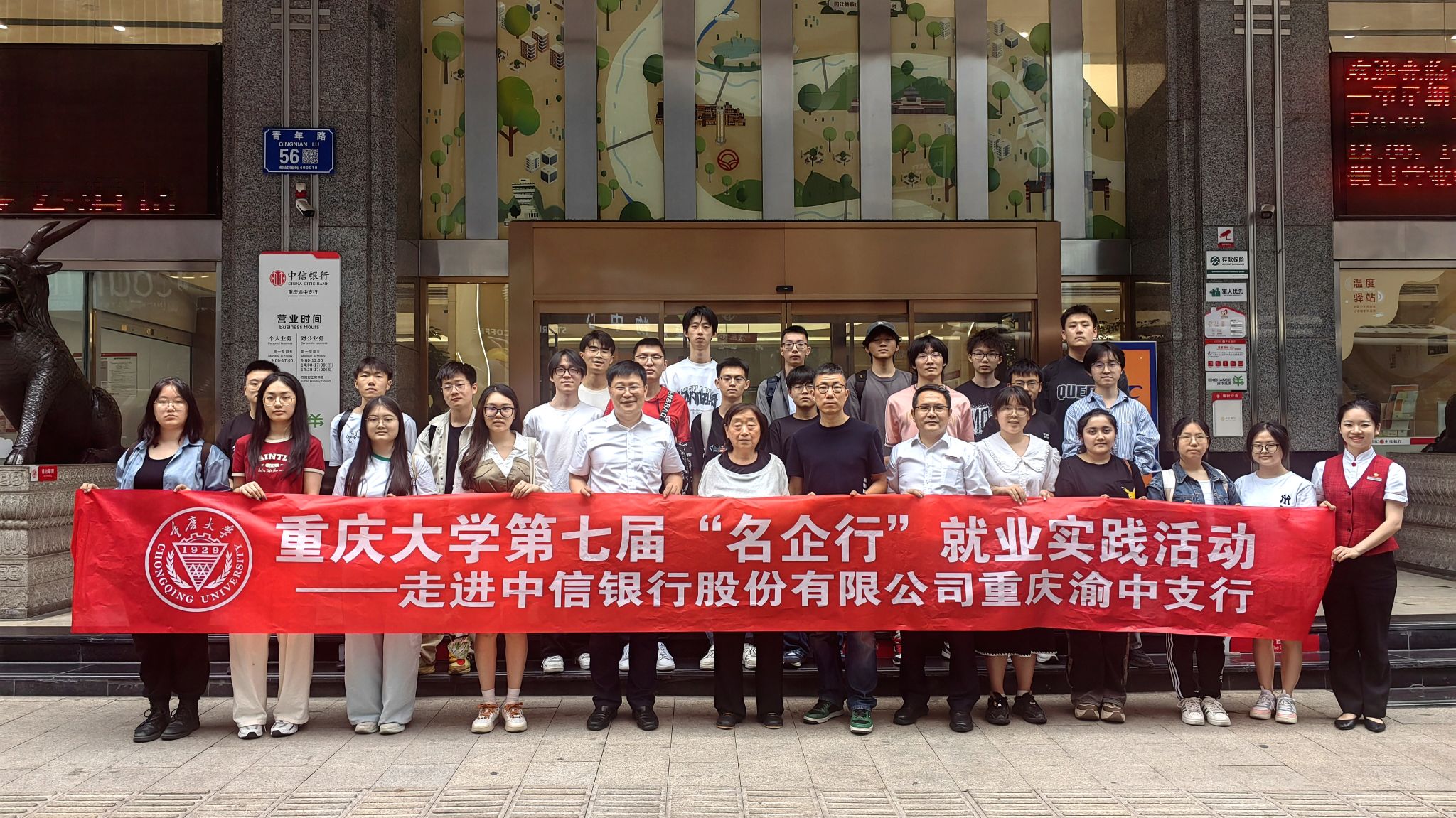职就中心举办的第七届“名企行”——走进中信银行股份有限公司重庆渝中支行实践活动。实践团队通过沉浸式的参观体验、特色业务解析、企业招聘介绍和校企座谈交流四个环节,全方位探索金融行业前沿动态与人才需求。