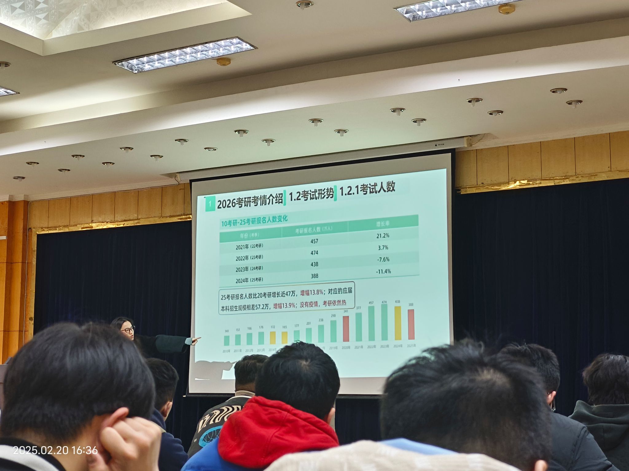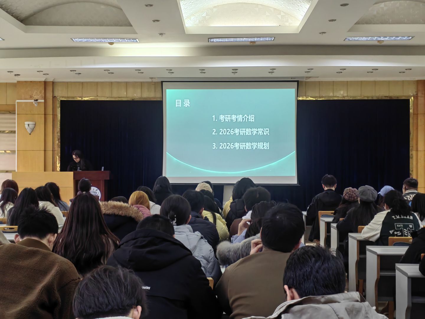 本次活动围绕考研考情介绍、2026届考研数学常识和2026届考研数学规划三个环节进行展开。活动开始,在场的同学们对新东方的吴老师表示了热烈的欢迎,而吴老师也向同学们做了简洁明了的自我介绍以便拉近和同学们的距离。在第一个环节中,吴老师用数据对比的形式向同学们展示了近几年的考研情况,例如考研人数的涨幅、成功上岸比例等等,让同学们有了更明确的认知。