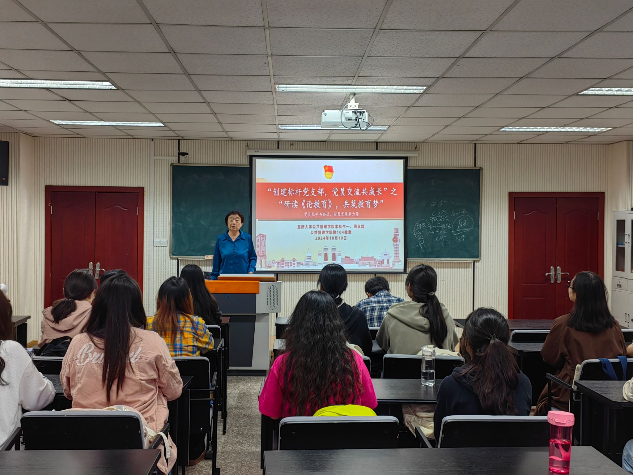本科生一、四支部全体党员、预备党员于学院楼104教室开展“创建标杆党支部,党员交流共同成长”之“研读《论教育》,共筑教育梦”主题党日活动。