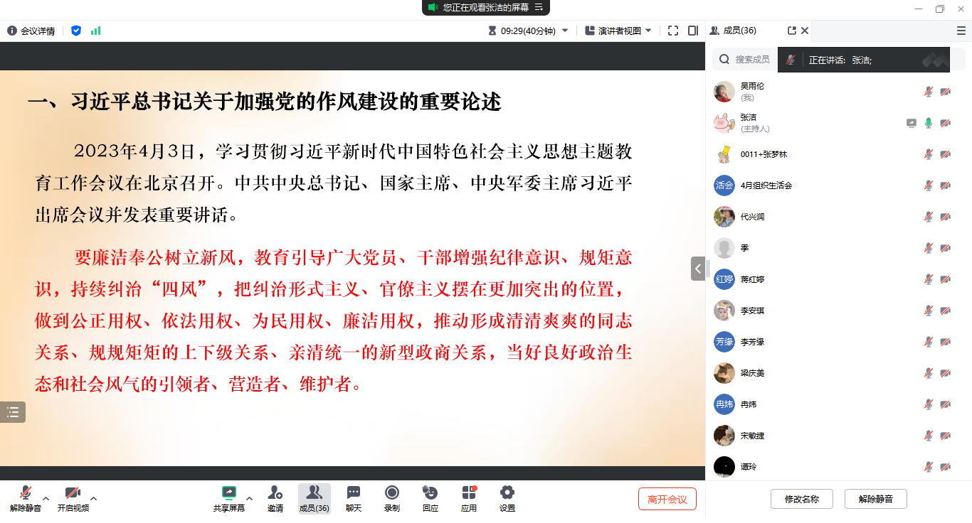会议第一项议题,全体党员通过PPT课件系统学习了习近平总书记关于加强党的作风建设的重要论述。裴绍蓉同志从“作风建设永远在路上”“八项规定是长期有效的铁规矩”“以钉钉子精神纠治‘四风’”等核心观点切入,结合党的十八大以来全面从严治党取得的显著成效,强调作风建设是党的建设的永恒课题,研究生党员更应严于律己、以身作则,在学术科研、社会实践、服务群众中体现党员的先进性与纯洁性。
