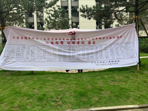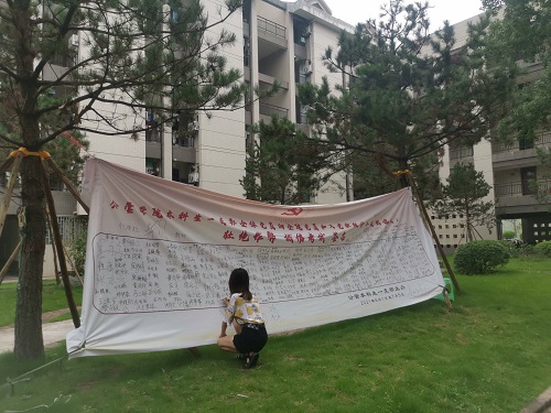 党员及积极分子发出倡议,并准备了“杜绝作弊,诚信考试”签名墙,鼓励同学们在墙上签名,以坚定诚信考试的决心,做出诚信考试的承诺。签名墙将一直放置于松园四幢,供同学们签名以明志的同时,也起到了扩大宣传的作用。不多时,雪白的签名墙便被同学们的名字所填满,透过苍劲有力的笔迹,我们充分体会到了同学们签名时的果断和决心,最后统计结果19.20级两个年级有340余名同学在签名墙上签上了自己的名字。