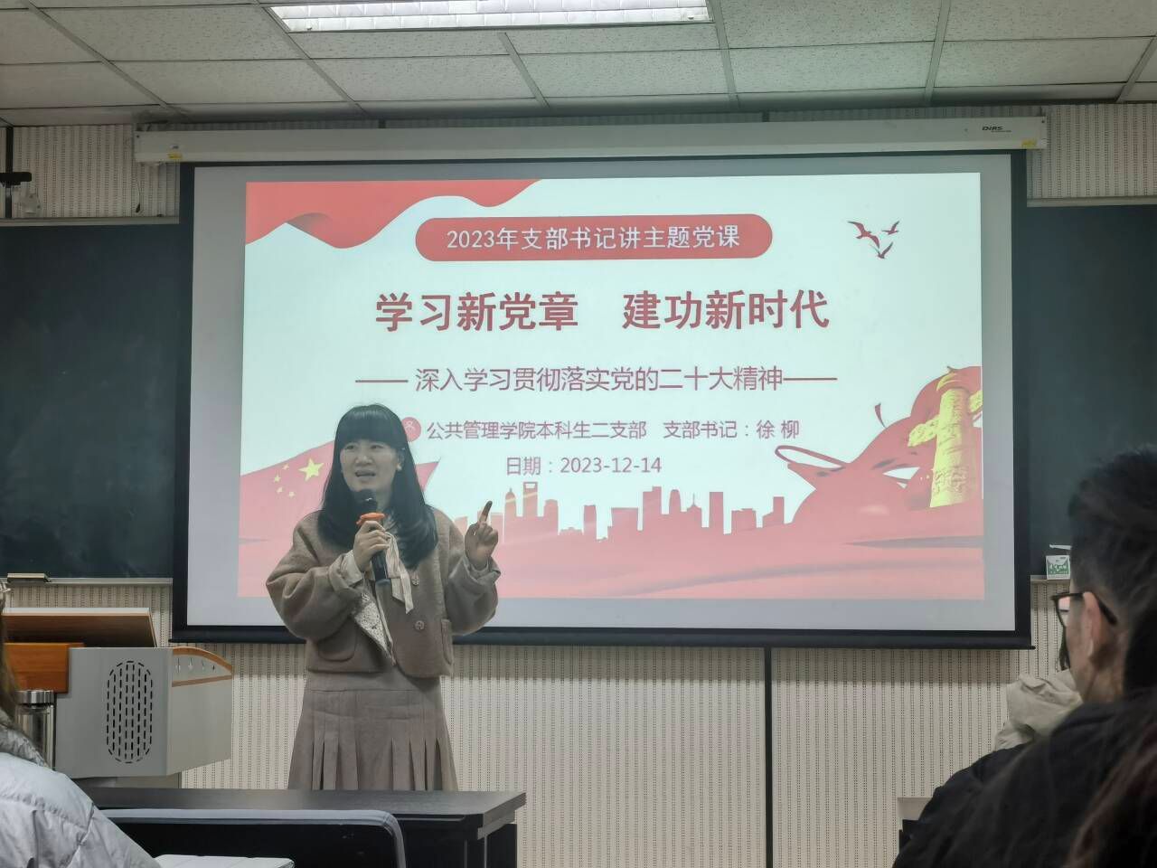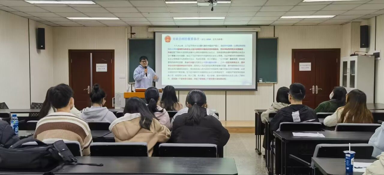 本科生二支部书记徐柳、五支部书记陈致远于2023年12月14日下午在学院106教室为两个支部全体党员讲授了“学习新党章,建功新时代”的主题党课。
