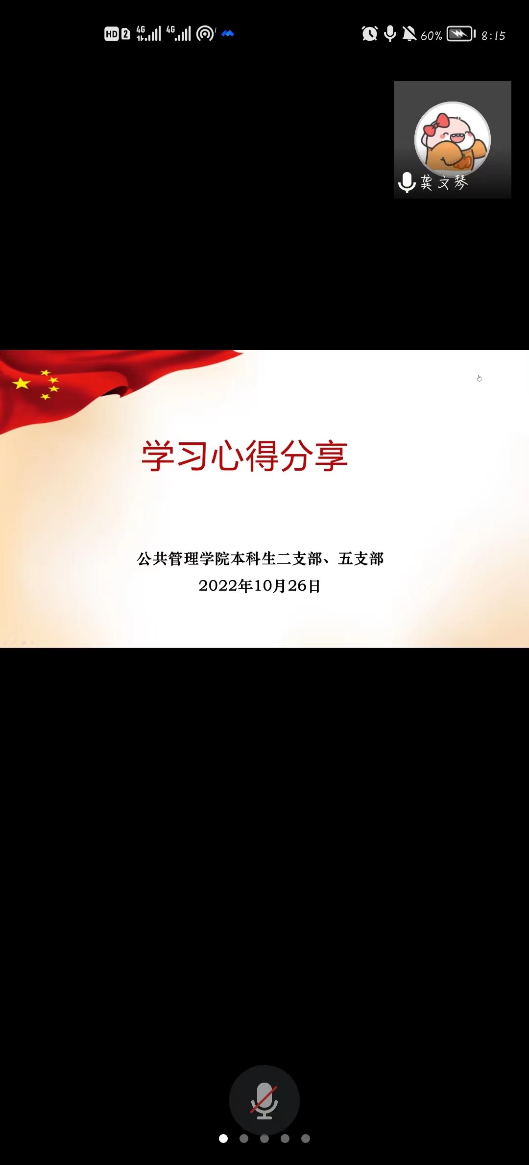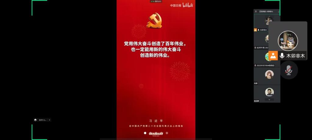 最后,同学们纷纷在线交流分享学习心得,21级研究生兼职辅导员陈致远同志谈到,作为学生党员在学习和科研当中,必须将个人理想融入党和国家事业之中,学术之路和人生之路才能越走越宽。入党积极分子林炜忻同学讲述了自己的二十大心得,表明作为新时代的一名青年学子,理应勇做走在时代前面的奋进者、开拓者、奉献者,努力使自己成为祖国建设的有用之才、栋梁之材,为实现中国梦奉献智慧和力量。徐柳老师最后也鼓励大家,祖国新时代十年的成就举世瞩目,这些伟大成就不是“天上掉下来”的,而是党和人民一道拼出来、干出来、奋斗出来的。作为当代青年学生,更要以全面建成社会主义现代化强国、实现第二个百年奋斗目标,以中国式现代化全面推进中华民族伟大复兴为使命任务。唯有奋斗前行,方能书写绚丽华章!