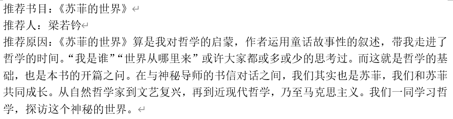 梁若钤同志推荐《苏菲的世界》,并表示:“在与神秘导师的书信对话之间,我们其实也是苏菲,我们和苏菲共同成长。从自然哲学家到文艺复兴,再到近现代哲学,乃至马克思主义。我们一同学习哲学,探访这个神秘的世界。”