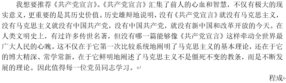 程成同志这样推荐《共产党宣言》:“这不仅在于它第一次比较系统地阐明了马克思主义的基本理论,还在于它的博大精深、常学常新,在于它鲜明地阐述了马克思主义不是僵死不变的教条,而是不断发展的理论。因此值得每一位党员同志学习。”