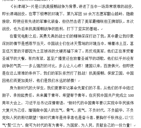 通过观看《长津湖》这部影片,大家致敬革命英雄,也深深意识到和平生活来之不易。我们不能忘记过去的艰苦岁月,我们应该接续奋斗,听党话跟党走,为中华民族的伟大复兴贡献一份力量!