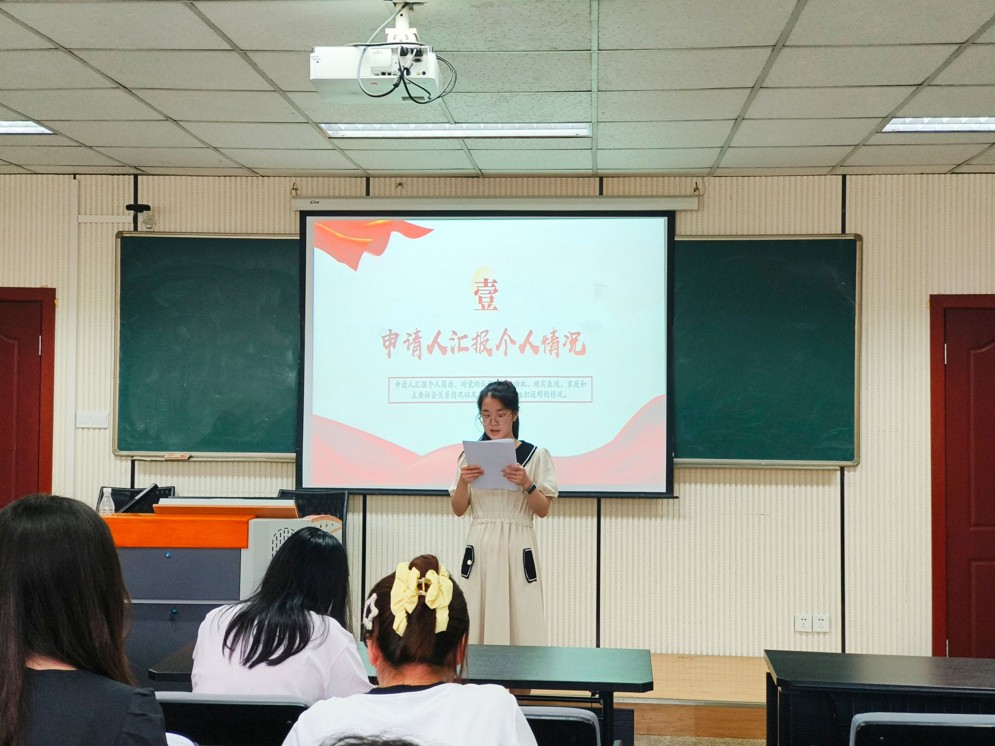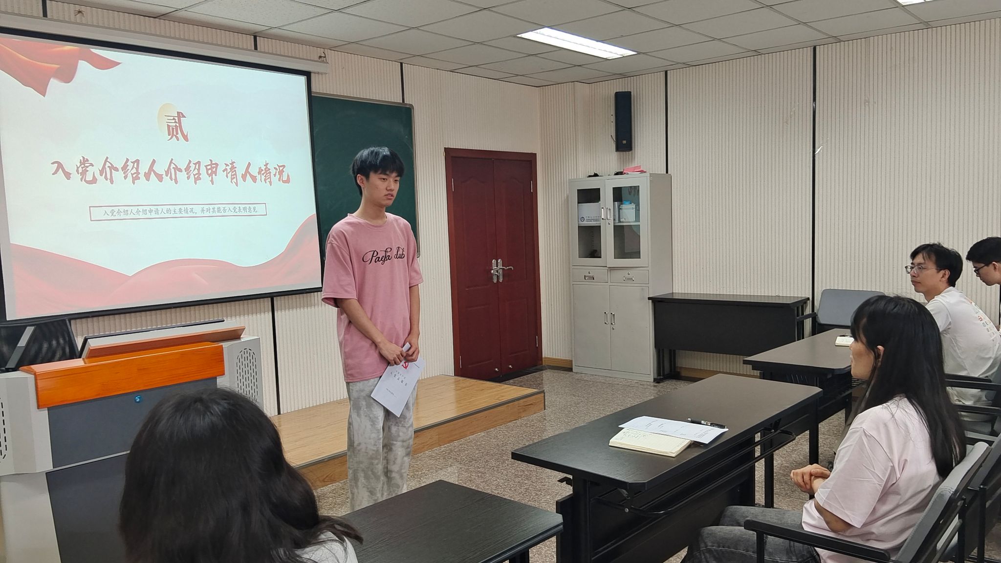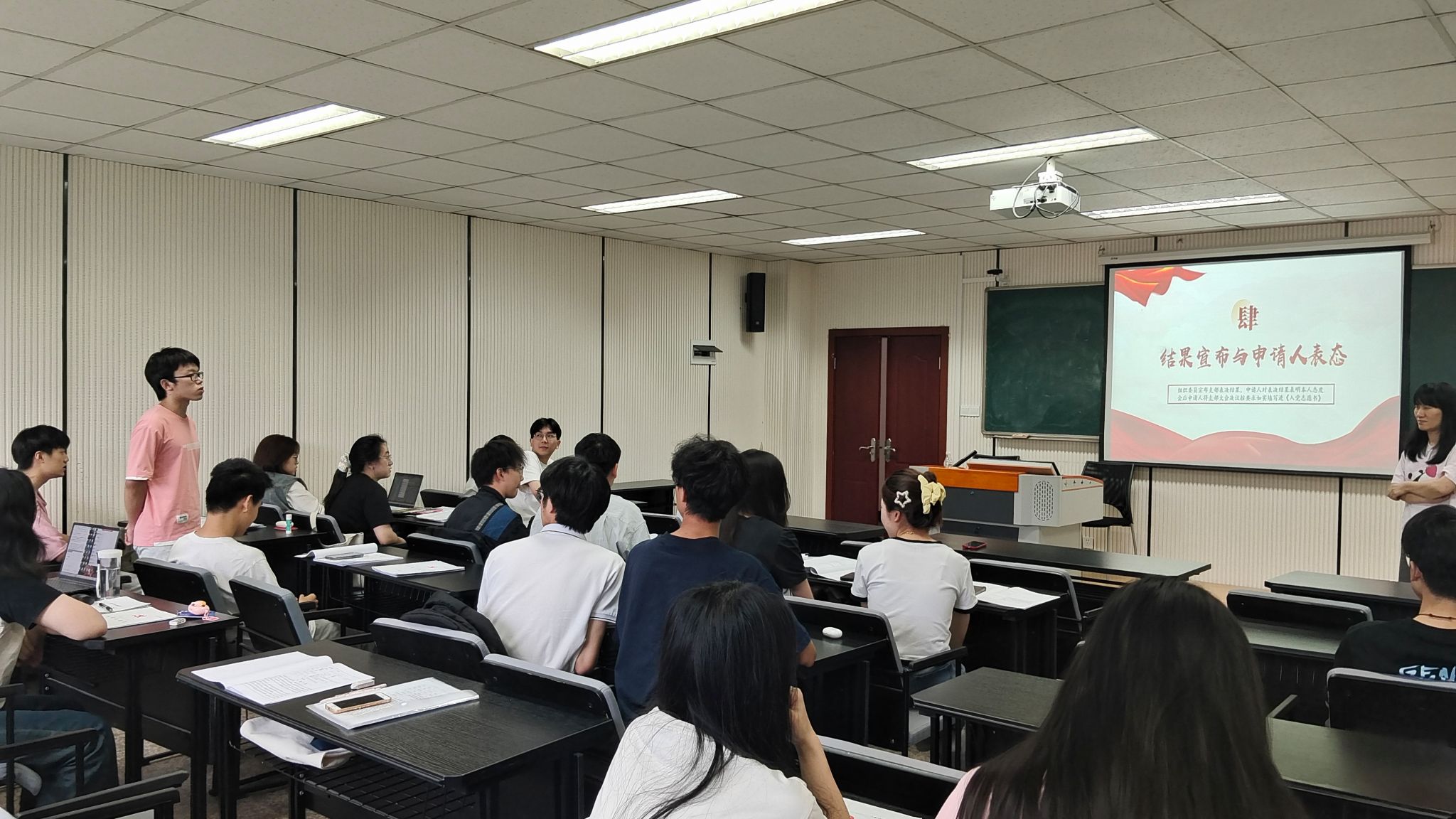 会上,本科生三支部书记范玉峰和六支部书记张源分别介绍了本次发展党员的基本情况。经过前期培养、考察和民主评议,2023级共有18名优秀本科生被列为第一批发展对象。随后,发展对象依次宣读入党志愿书,汇报了对党的认识、入党动机、个人表现及未来努力方向。他们的入党介绍人分别介绍了发展对象的培养考察情况,并对其能否入党表明了意见。