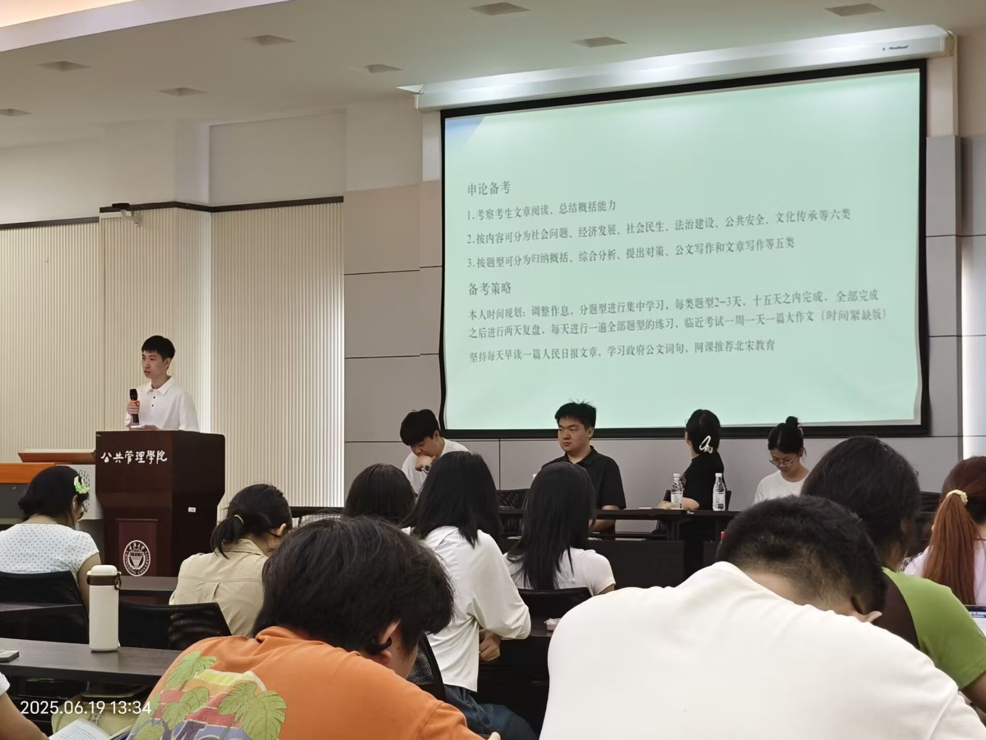 2025年6月19日13:00,为帮助22级的同学明晰发展路径,本科生一支部发挥样板支部示范引领作用,联合本科生第四党支部举办“21级学长学姐经验交流分享会”,聚焦考公、考研、留学、就业四大方向,邀请8位优秀21级学长学姐深度分享成长经验,全年级159名同学积极到现场参与。