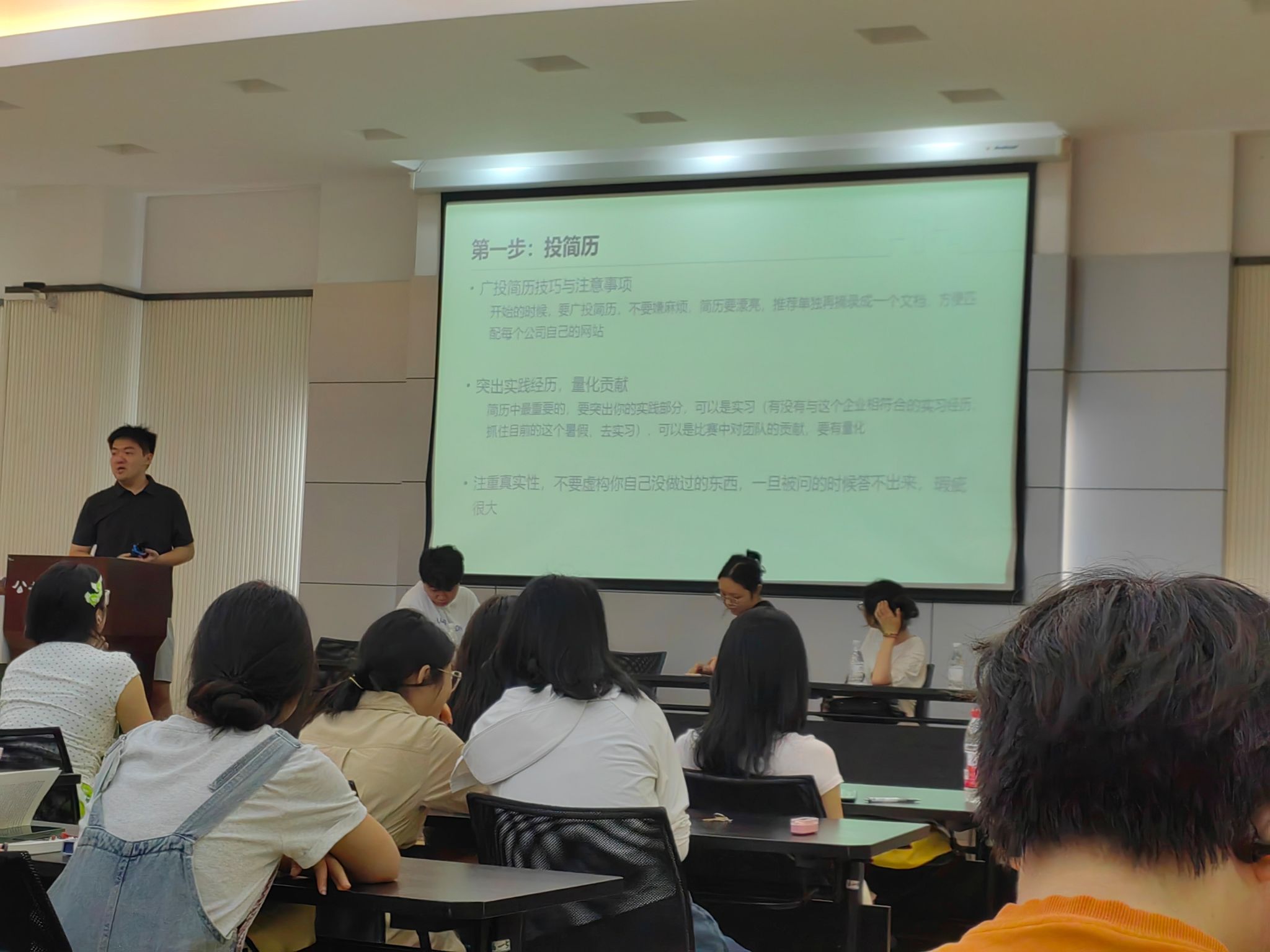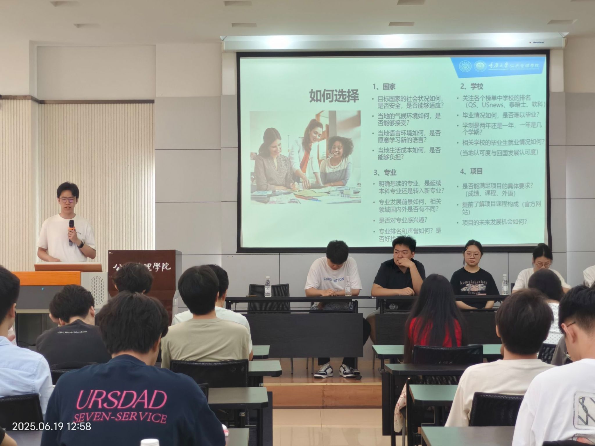21级学长孙靖奇围绕“留学申请全周期”展开,对比港校与英校申请差异,文书撰写突出“故事化叙事”。21级学长郭新宇分享“跨专业申请技巧”,将城管专业与“可持续发展”“环境规划”方向结合,打造独特申请优势。他还现场分享“留学资源包”,涵盖院校清单、文书模板。