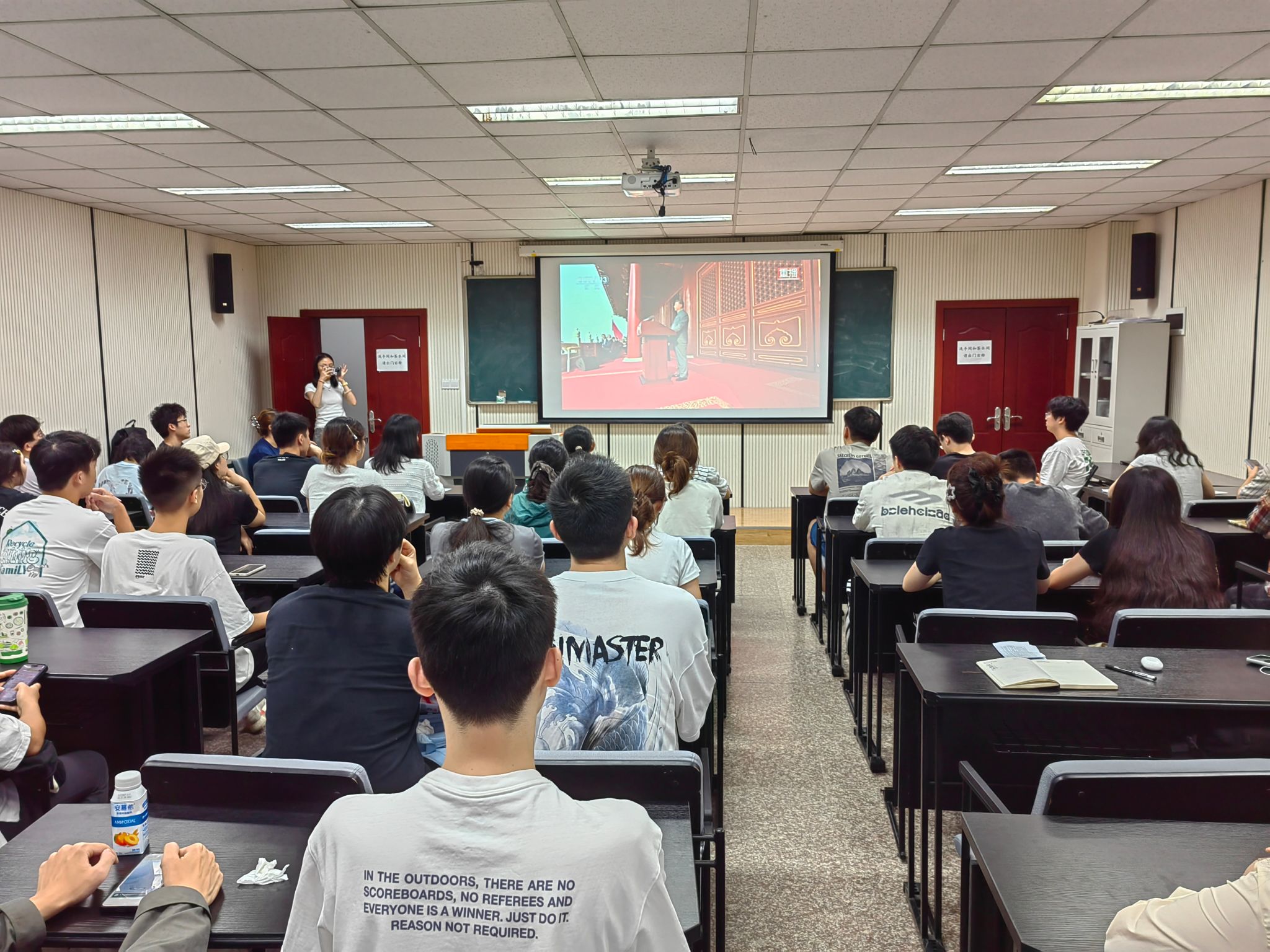 活动伊始,曹李思帆同志带领全体成员回顾了“九三阅兵”的庄严时刻。通过播放阅兵片段,那一幕幕震撼的画面唤醒了同学们对这一国家盛典的深刻记忆。随后,曹李思帆同志围绕习近平总书记在纪念中国人民抗日战争暨世界反法西斯战争胜利八十周年大会上的重要讲话,深入解读其核心要义,号召全体支部成员自觉传承和弘扬伟大抗战精神,以昂扬的姿态在强国建设、民族复兴的新征程上勇担使命。