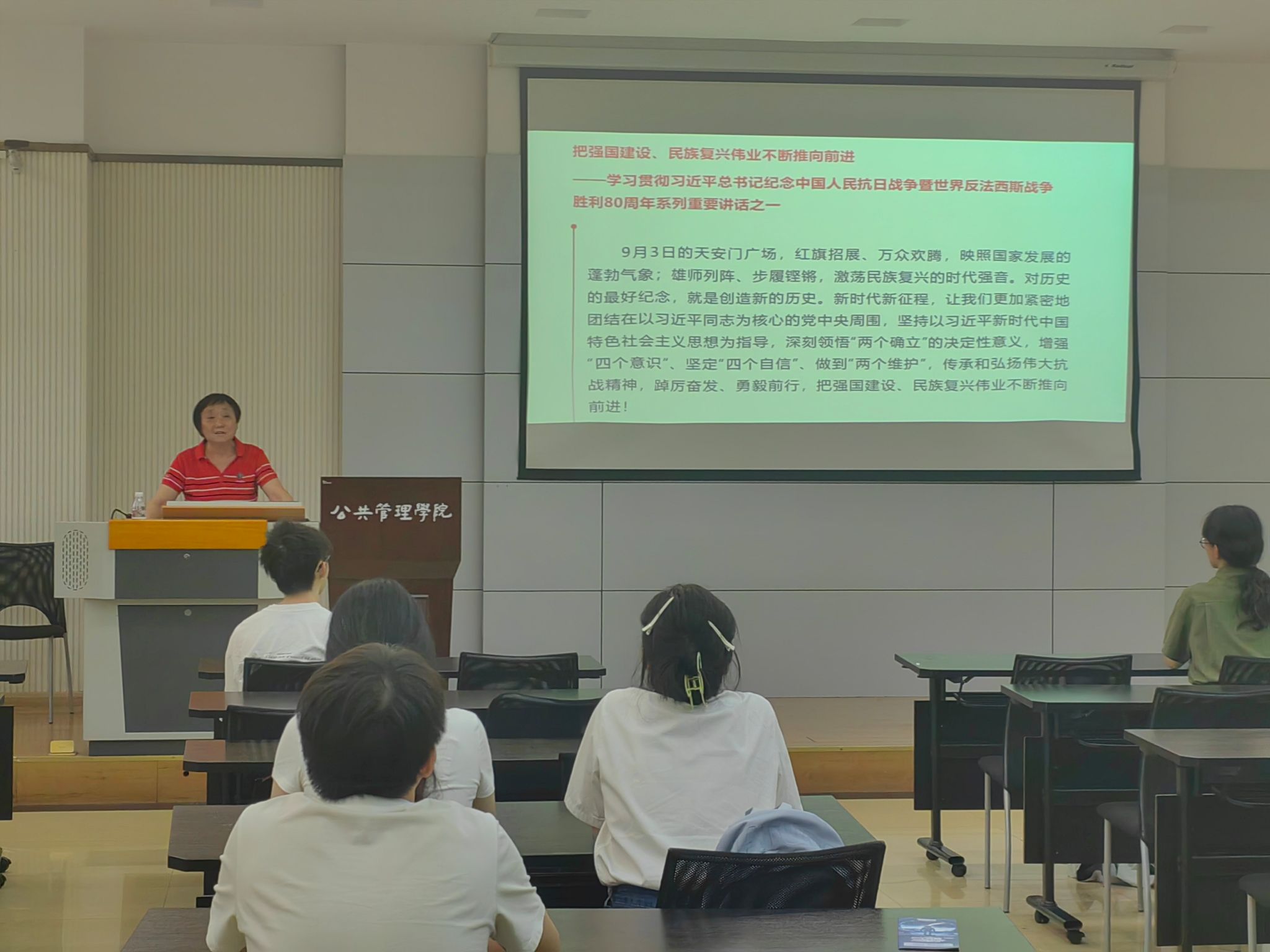 活动伊始,全体与会人员共同观看了相关视频,回顾了中国人民抗日战争和世界反法西斯战争的艰辛历程和伟大胜利。随后,本科生一支部书记王丽娟带领大家学习了讲话原文,深入解读了讲话中关于铭记历史、缅怀先烈、珍爱和平、开创未来的重要论述。