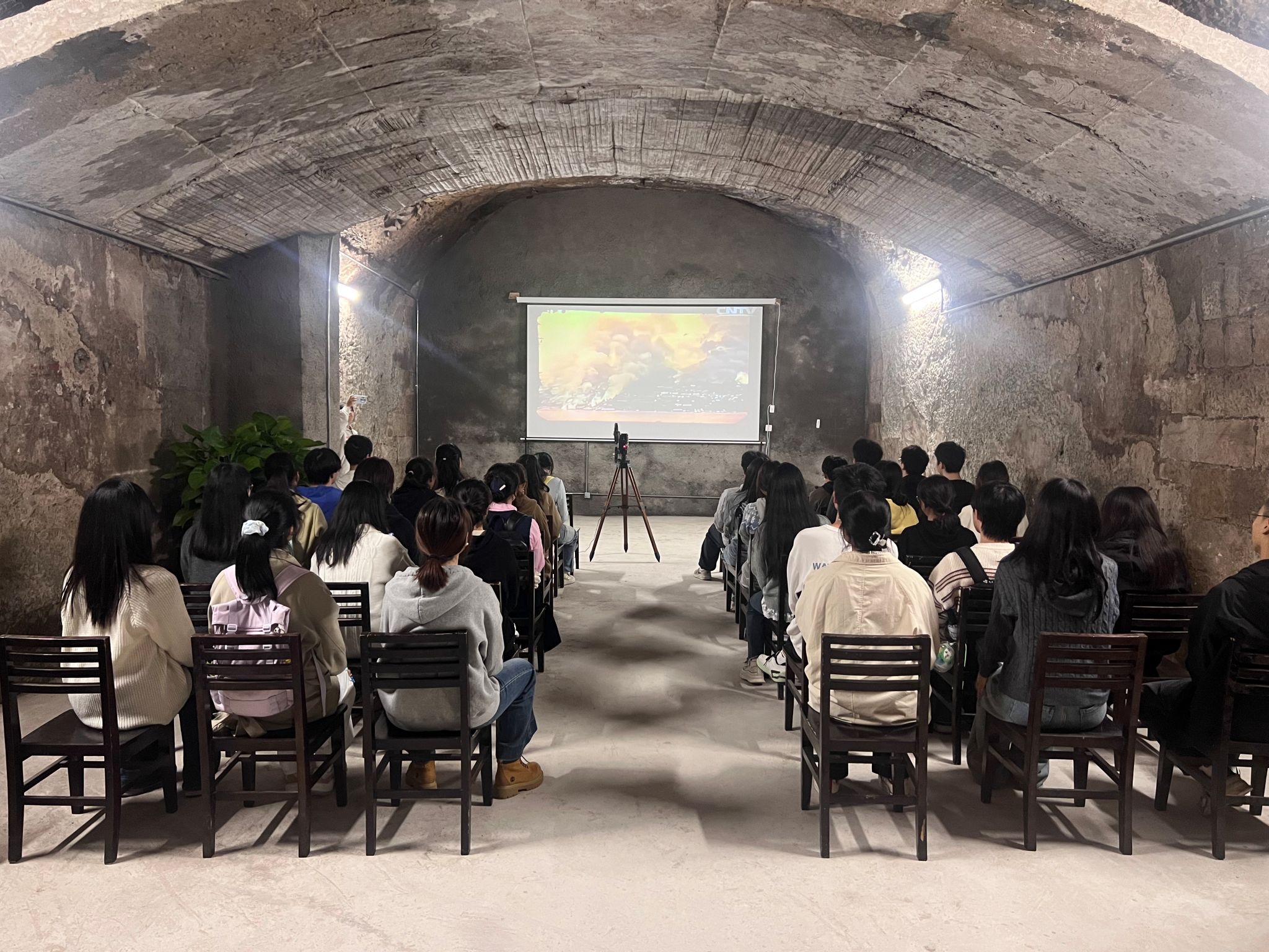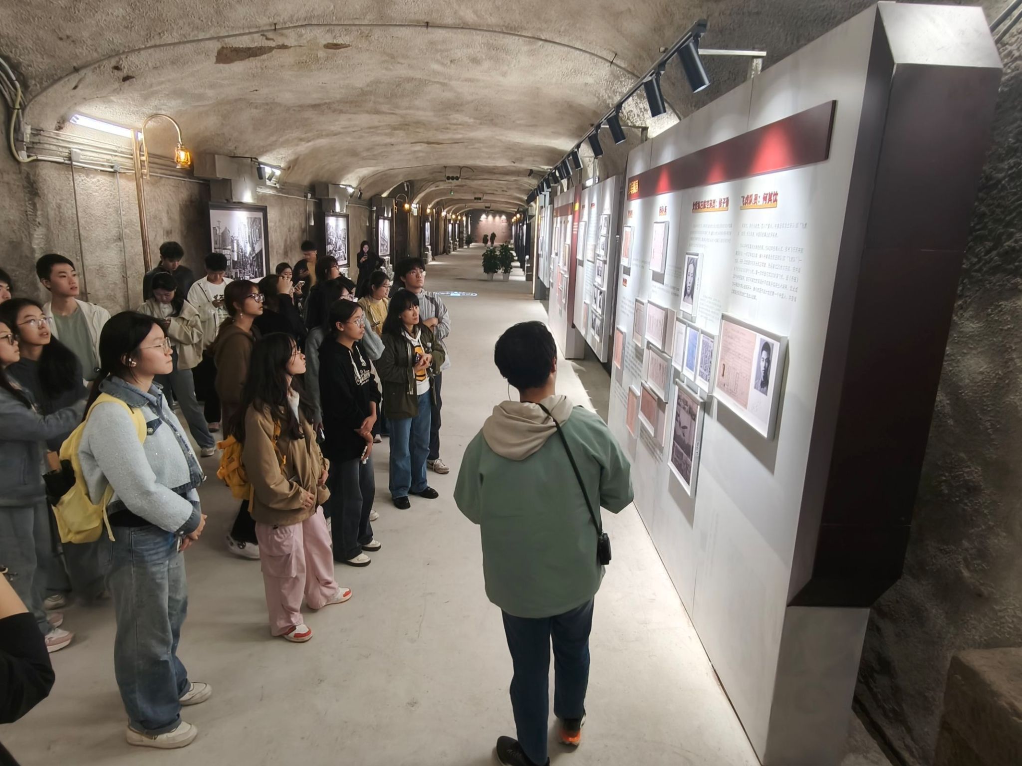 活动伊始,基地讲解员的声音轻轻推开了时光的闸门。随着脚步深入防空洞,潮湿的空气中仿佛还留存着战火年代的印记——泛黄的校史文献、定格着往昔的老照片,每一件实物都在无声诉说着69书吧