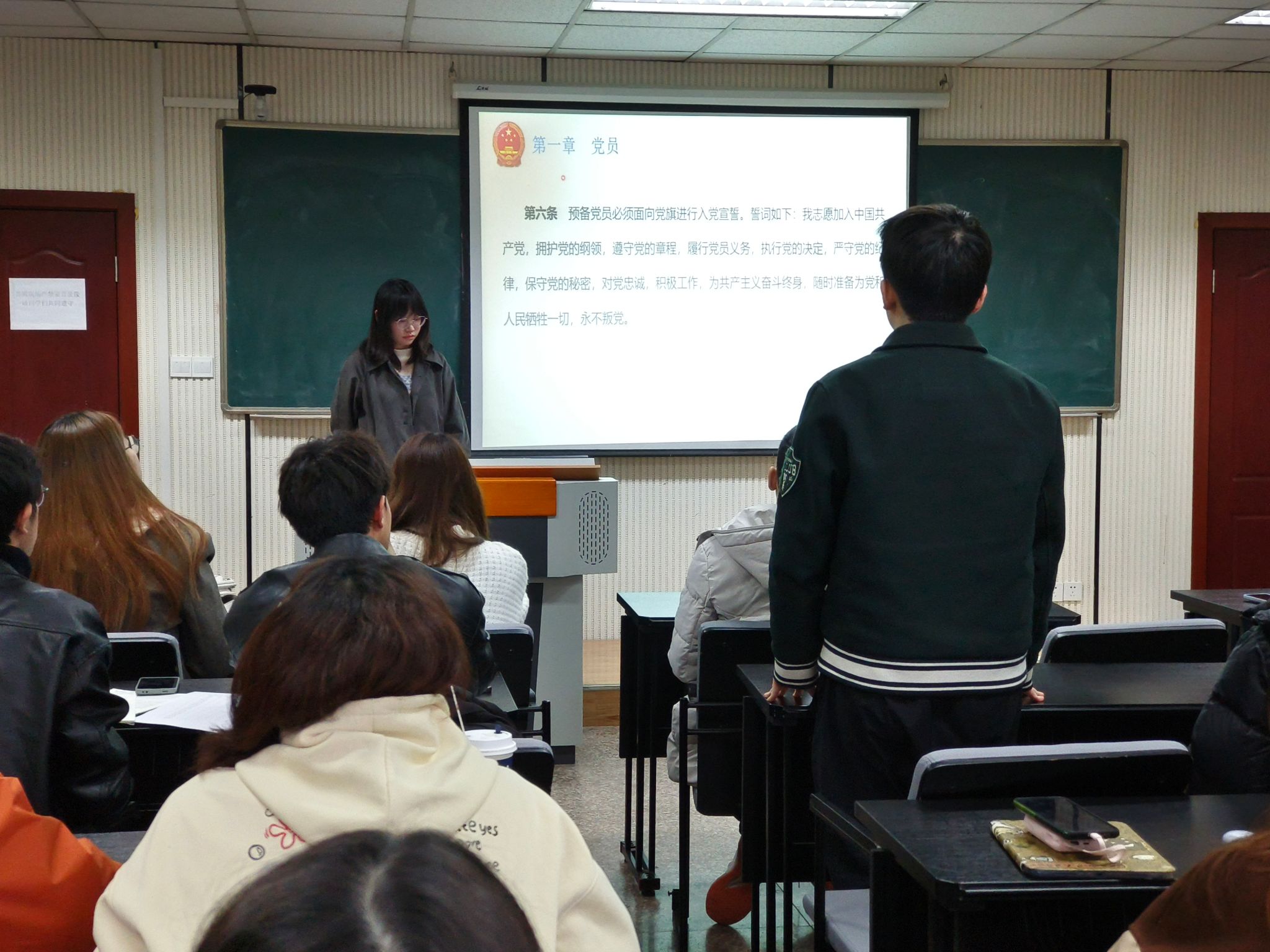 随后,活动进入诵读环节。全体党员庄重肃立,依次高声朗读党章第一章“党员”和第七章“党的纪律”的各项条例。诵读过程中,大家声音铿锵有力、感情真挚,逐条学习了党员的条件、义务、权利以及入党程序等重要内容。诵读结束后,李庆书记结合学习生活实际,对每一条款进行了详细解读,尤其针对党员的义务和权利部分作了重点阐释。她强调,党员义务是每位党员必须履行的责任,是发挥先锋模范作用的行动准则;党员权利是党内民主的重要保障,是党员参与党内事务、发挥作用的基础。通过逐字逐句的诵读和条分缕析的讲解,大家更加明晰了党员身份的核心要义,进一步了解了党章对党员政治信仰、行为准则的根本规范,强化了对“什么是党员、如何做合格党员”的认知,为后续践行党章要求筑牢思想根基。