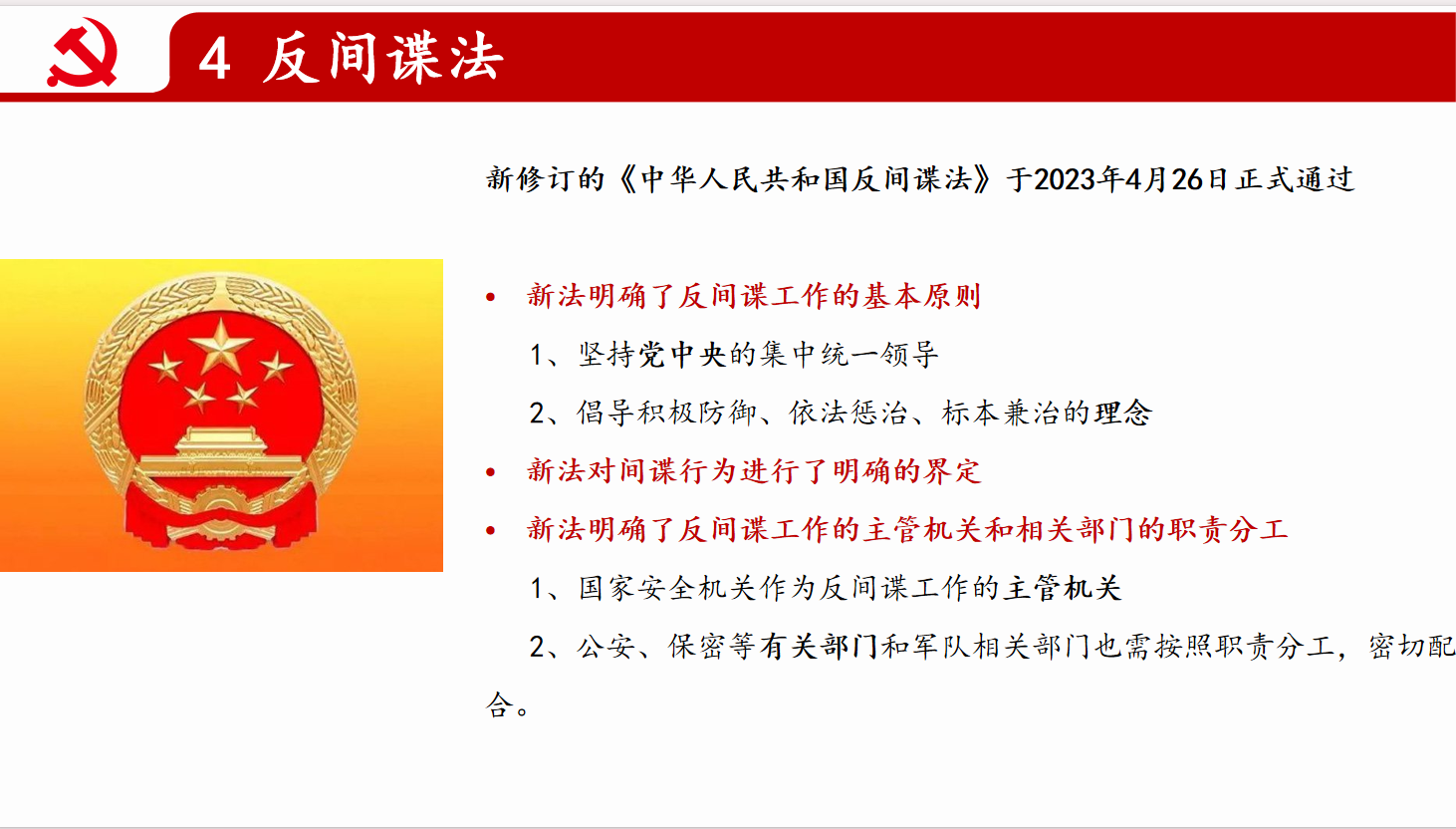最后,同学们踏入线上讲座的最后一个环节——《中华人民共和国反间谍法》的学习。新修订的《中华人民共和国反间谍法》明确了反间谍工作的基本原则、反间谍工作的主管机关和相关部门的职责分工,并对间谍行为进行了明确的界定。除此之外,还强调了国家机关、人民团体、企业事业组织和其他社会组织的主体责任以及依法办事、保障人权的原则。