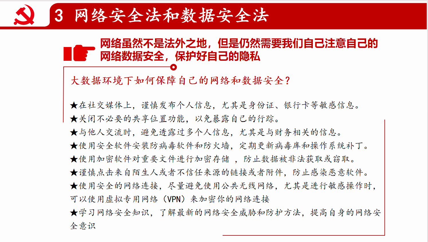 在现代信息技术高度发展的时代,网络安全已成为关注的焦点。为保障同学们在网络虚拟世界中的信息安全等,同学们依次学习了《中华人民共和国网络安全法》和《中华人民共和国数据安全法》。学习了如何在大数据环境下保障自己的网络和数据安全。