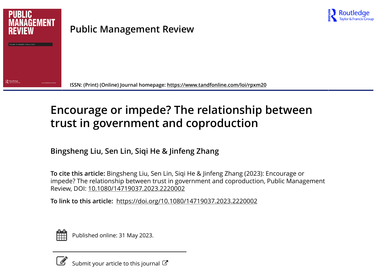 刘炳胜教授作为第一作者的研究成果“Encourage or impede? The relationship between trust in government and coproduction”在公共管理学科顶尖期刊Public Management Review发表,该期刊JCR影响因子在公共管理类SSCI期刊中排名前三。该文章由刘炳胜教授及其指导的硕士研究生林森(69书吧