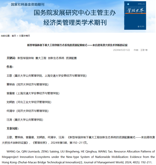 王歌副教授作为第一作者的研究成果“新型举国体制下重大工程创新生态系统的资源配置模式——来自港珠澳大桥技术创新的证据”在中文管理类顶级期刊《管理世界》发表。《管理世界》是国务院发展研究中心主管、主办的经济类管理类学术期刊,在我国三大社科期刊评价系统的评价中,居管理类学术期刊首位;在中国社会科学院期刊评价中,被誉为管理学唯一“顶级期刊”;在国际影响力方面,国内管理学期刊排名第一,是我院在中文管理类顶级期刊取得的重要突破。