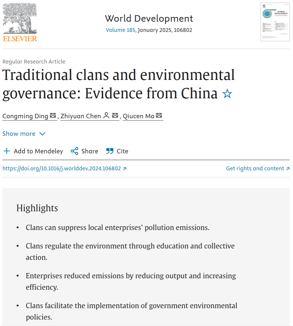 丁从明教授作为第一作者的文章《Traditional clans and environmental governance: Evidence from China》在经济学科高水平期刊World Development在线发表。World Development是发展研究(Development Studies)领域的国际顶级刊物,影响因子在发展研究和经济学期刊领域中长期名列前茅,属于JCR1区和中科院一区Top期刊。该论文是由丁从明教授及其指导的硕士生陈致远,博士生马秋岑共同完成。是近年来在69书吧