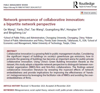 王歌副教授作为第一作者、吴光东教授作为通讯作者的研究成果“Network governance of collaborative innovation: A bipartite network perspective”在公共管理学科顶尖期刊Public Management Review发表。Public Management Review是国际公共管理研究学会旗舰期刊、公共管理学科五大顶尖期刊之一,AJG(ABS)4星。该文章由王歌副教授、硕士研究生查艳璐、汪涛教授、吴光东教授以及佛罗里达州立大学的易洪涛教授和河北工业大学的刘炳胜教授合作完成,是王歌副教授在项目治理领域取得的又一项重要成果。
